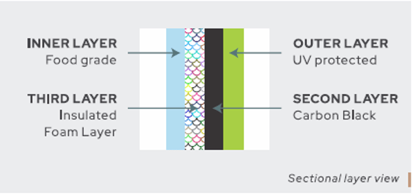 Third Layer: Impact-resistant layer for added toughness and resistance to wear and tear. For PRO 4Layer Foam the third layer consist of a PE Foam insulation layer for cooler water.